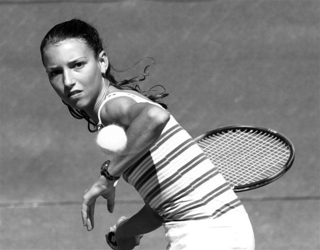 7 DAS WEISSE IM AUGE hat die Tennis-Spielerin, während sie zum möglicherweise entscheidenden Schlag ausholt.
