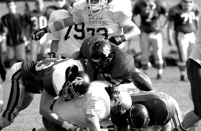 8 WÜSTE KEILEREI: Was wie eine chaotische Rangelei um das Leder-Ei aussieht, ist das Ergebnis eingeübter Spielzüge. Nicht ohne Grund wird Football auch „Schach auf dem Rasen“ genannt.